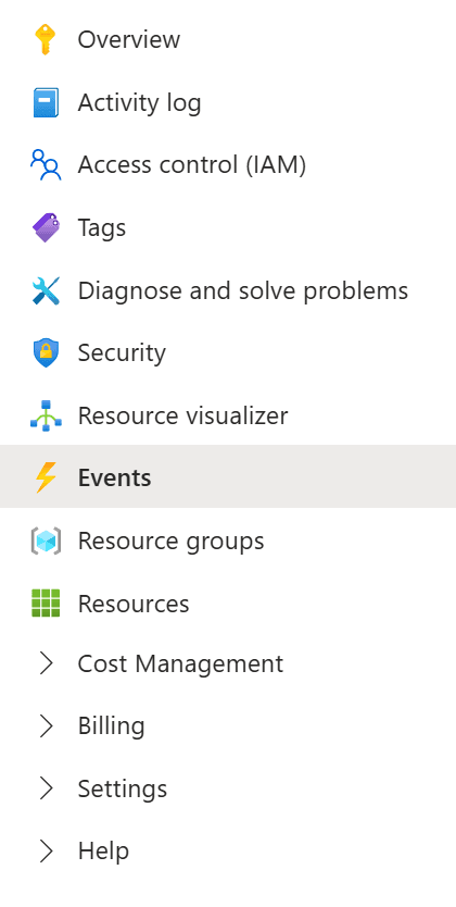 - Klicka på Events i menyn och välj + Event Subscription.