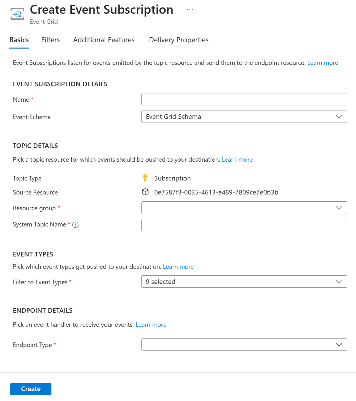 Välj Endpoint Type dit eventet ska skickas, t.ex. Azure Function,Azure Monitor Alert, Event Hub, Service Bus eller Webhook.